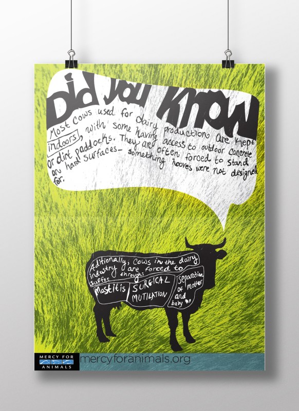 I designed these posters to raise the viewer’s awareness of the reality of factory farming, while promoting Mercy for Animals as an organization. The use of hand lettering, simple graphics, and textures are intended to create a non-threatening visual appeal to draw the viewer in.