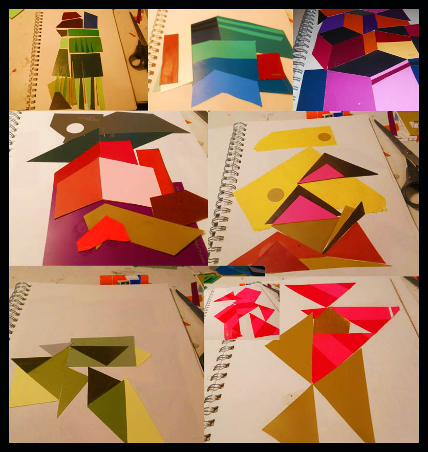 All you need are paint samples (get as many as you can from a hardware store-they’re free), scissors, a gluestick, and your sketchbook.
