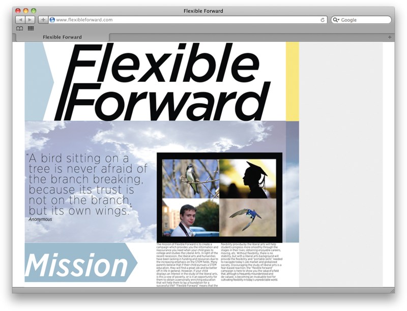 Flexible Forward is a visual communications campaign to promote the value of a liberal arts education. The campaign is geared toward parents of college students who are ambivalent towards their children taking on a liberal arts major. The goal is to educate those parents on the benefits of a liberal arts education, and reassure them that their child can thrive after college with a liberal arts degree.