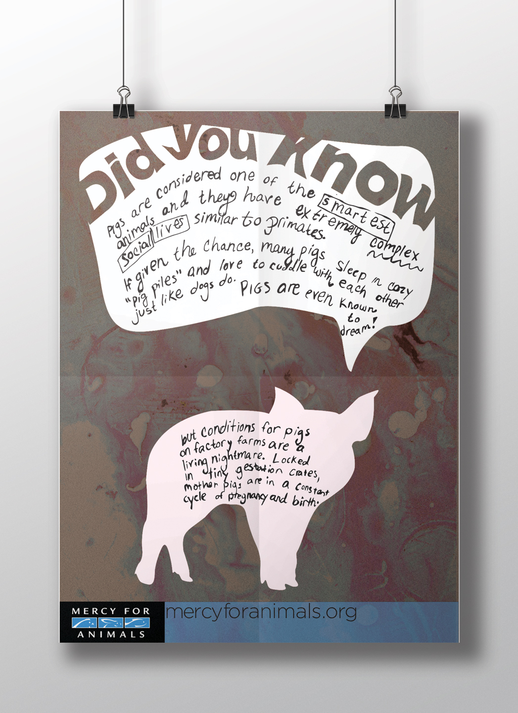 I designed these posters to raise the viewer’s awareness of the reality of factory farming, while promoting Mercy for Animals as an organization. The use of hand lettering, simple graphics, and textures are intended to create a non-threatening visual appeal to draw the viewer in.